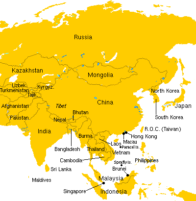 Philippinen Russland Kasachstan Turkmenistan Usbekistan Pakistan Kirgisien Pakistan Mongolei China Tadschikistan China China Taiwan Südkorea Südkorea Nordkorea Japan Macao Hong Kong Bhutan Nepal Indien Burma Bangladesh Thailand Vietnam Kambodscha Laos Vietnam Sri Lanka Singapur Indonesien Malaysia Afghanistan