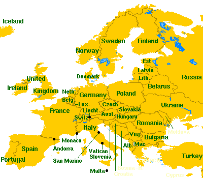 Polen Island Zypern Irland Großbritannien Norwegen Schweden Finnland Estland Lettland Litauen Weißrussland Russland Dänemark Niederlande Belgien Frankreich Luxemburg Deutschland Schweiz Portugal Spanien Andorra Monaco Italien Italien Italien Slowenien Tschechien Österreich Slowakei Ungarn Rumänien Ukraine Bosnien Bosnien Kroatien albania Serbien und Montenegro (Jugoslawien) Mazedonien Griechenland Türkei Bulgarien Moldawien Malta Liechtenstein